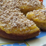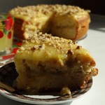 Затем смазываем верх пирога. Я его ещё разрезала на 2 коржа и смазала и внутри. Сверху посыпаем ореховой крошкой и подаем к столу.