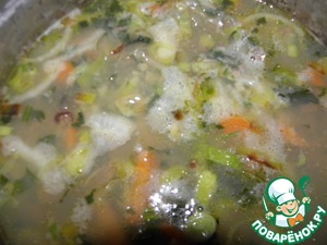 Через 10 минут в бульон с печенью добавить обжаренные овощи и посолить. Варить еще 20 минут