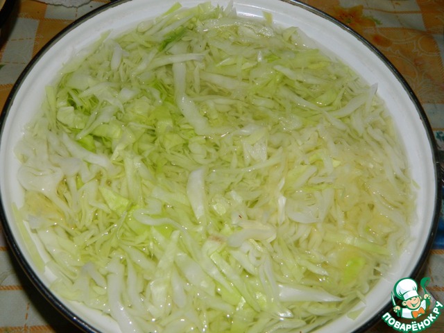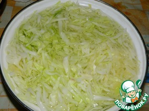 Капусту нарезать и залить кипятком минут на 10-15. Затем воду слить и промыть её в холодной воде. Хорошо отжать.