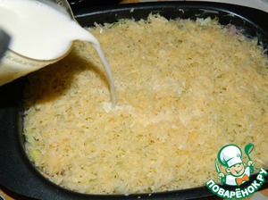 Залить жирным молоком. Почему именно жирным?... потому что при выпекании молоко с капустным и мясным соком створожится и тем самым свяжет между собой все ингредиенты запеканки. И в готовом виде она не развалится, а аккуратно разрежется на кусочки.