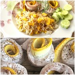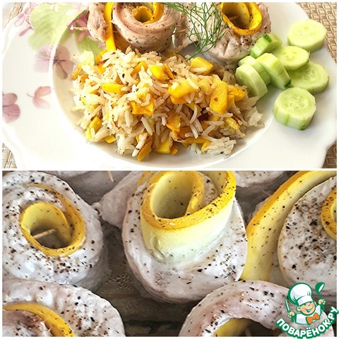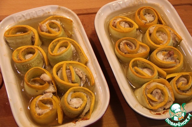 2. Филе нарезать тонкими пластинками, сбрызнуть оливковым маслом. Посолить, поперчить. На каждую пластинку кабачка положить полоску филе.
