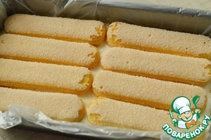 2. Форму, я брала прямоугольную для кекса, выстелить пленкой. На дно выложить 1/3 крема. Поставить форму в холодильник, чтобы желе немного схватилось. Затем достать форму, сверху положить полоски печенья. Между ними выложить малину.