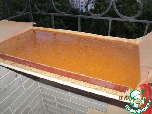 лист ДСП и 4 брусочка. Выбираем солнечное, не пыльное место. На лист выстилается пекарская бумага и слегка смазывается растительным маслом (без него пастилу будете кушать с бумагой, т. к. она очень прилипает). Выливается на неё абрикосовая смесь толщиной 1 см. Хочу сразу сказать - мухи пастилу игнорируют. Никто не будет по ней ползать. Первоначально я завешивала её марлей, но марля скрадывает солнце, и процесс сушки продлевается. Для сушки надо 3-7 дней (пастила сохнет с краев, когда середина на пальце не оставляет сиропа - готово).