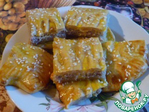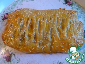 Перенесла на противень с пергаментом и обильно смазала слойку взбитым желтком с 1 ст. л. молока. В дырочки вылила остаток и посыпала сверху кунжутом.