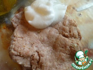 У меня был готовый котлетный фарш, я добавила в него немного воды, перемешала, чтобы фарш стал мокрый. Как на чебуреки.