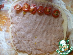 На тонко раскатанное тесто ровным слоем выложить фарш. На один край я положила кусочки помидора.