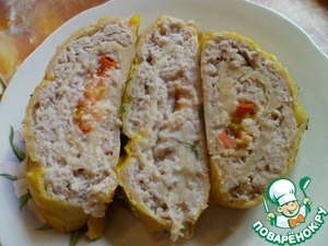 На одну половину теста выложила немного фарша, вторую часть теста прошла роликом. -
