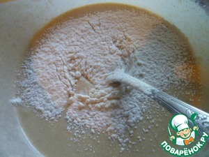 Аккуратно ввести просеянную муку с щепоткой соды.