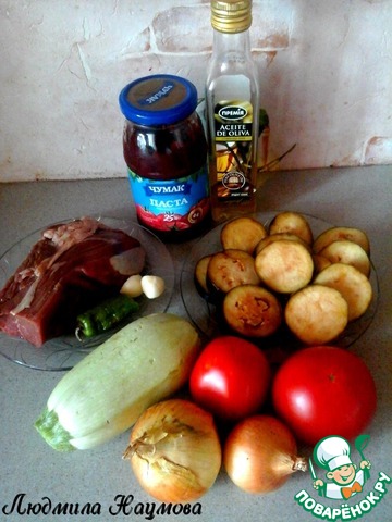 Мясо промыть и нарезать с остальными овощами кубиками по 1,5-2 см. В чашу мультиварки выложить все ингредиенты, добавить масло, томатную пасту и соль. Тщательно перемешать. Закрыть крышку и поставить на 1 час на программу "Тушение". -