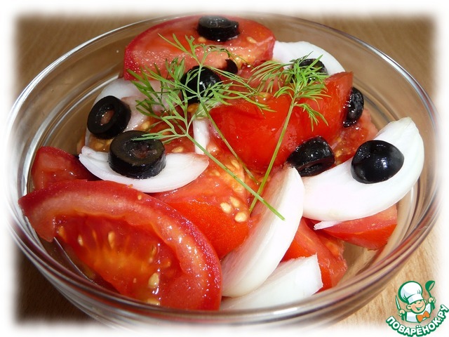 Луковицу нарезать вдоль, маслины порезать кружочками, добавить соль, уксус и масло непосредственно перед подачей, чтобы уксус не начал мариновать овощи. Можно добавить немного петрушки. Уксус используем любой, по вашему вкусу. Я добавила яблочный, он придал свой аромат и немного сладковатый вкус.