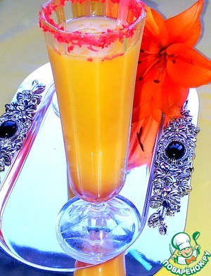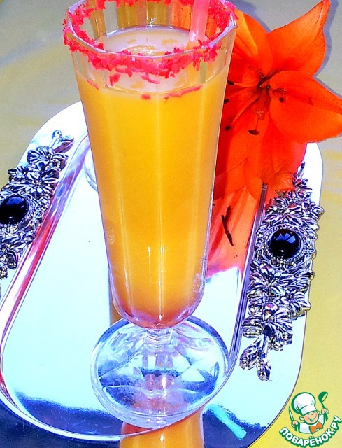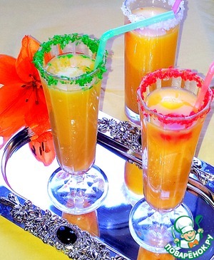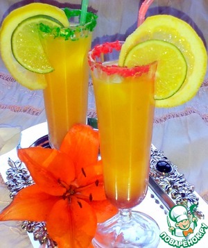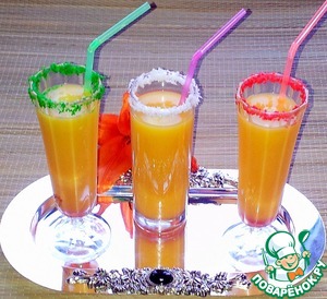 Так же заранее подготовить бокалы. Смочить их края в воде и обвалять в кокосовой стружке, можно в сахаре... В бокалы налить сок и положить в каждый по кусочку имбиря.