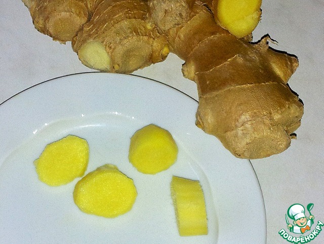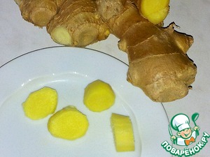 Отрезать кусочек имбиря см 5 - 6. Почистить и разделить его на 4 части.