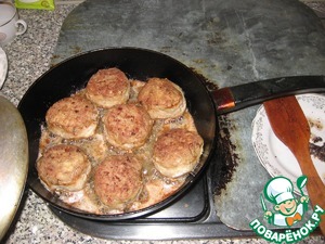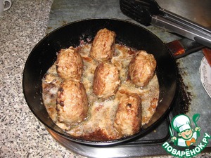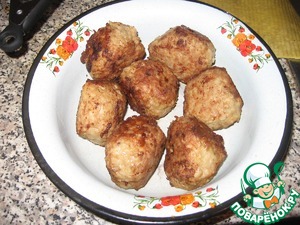 Смочив руки холодной водой лепим крупные тефтели и, обваляв в муке, жарим их на растительном масле.