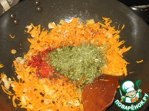 Добавим морковь, аджику и специи. Пусть потушится немного.