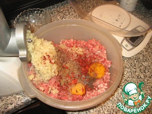 Добавляем в фарш яйца, приправы и специи, солим и перчим. Хорошо перемешиваем.