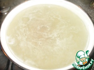 Что Вы говорите? Вода в кастрюльке закипела, а "шум" мы не сняли? Ничего, нам эта пенка не нужна... Процеживаем и сливаем этот бульон в отдельную посуду. Он нам пригодится для "тефтельных дел". А вот в опустевшей кастрюле хорошо промываем мясо и ставим его отвариваться уже минут на 40. Можете сразу положить и картошку с рисом. Я, например с детства помню, что Харчо это такой суп, в котором рис разварен на букву "Х". Вот и давайте разварим!
