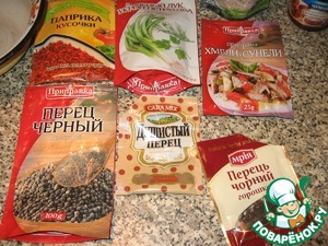 - Приправа ("Смесь зелени кусочками".По 2 на блюдо. "Паприка сладкая Кусочки". По 2 на блюдо.) — 4 ст. л.