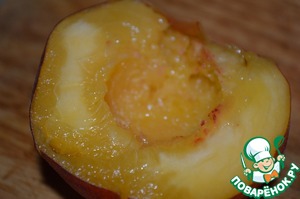 Персики вымыть, разрезать пополам и удалить косточку.
