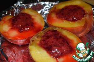 Половинки персиков выложить в жаропрочную форму, начинить вишневым пюре.