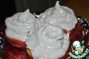 Взбитые белки поместить сверху на персики.