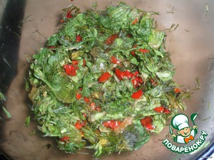 Шпинат, зелень нарезать и слегка потушить в растительном масле.