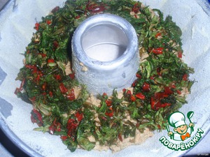 Лук мелко нарезать и обжарить. Смешать с творогом и чесноком. Форму обмазать маслом и обсыпать манкой. Равномерно выложить паштет, сверху зелень и закончить творогом. Извините, форма попалась не под паштет. Думаю, это не смертельно!