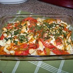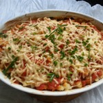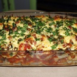 И верхним слоем кладем соус. Посыпаем тертым сыром, зеленью и ставим в разогретую духовку до 180 - 190 гр на 30 мин. потомиться и пропитаться соусом.