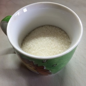 Я начинаю приготовление с сиропа. Для этого берём обычную кружку, вмещающую 200 мл, и засыпаем в нее 100 г сахара.