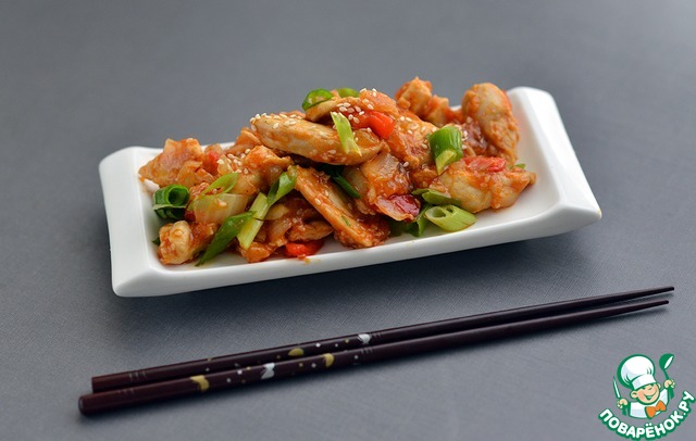 Быстрое в приготовлении китайское блюдо – очень ароматное, простое, но очень вкусное. Главное – все ингредиенты должны быть нарезаны, потерты, размешаны и стоять на столе – времени будет мало. Это одно из разновидностей блюда – с кунжутом. Если делать оригинальную версию, то необходим жареный арахис.