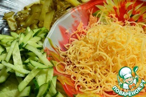 Огурчики нарезать как нравится, сыр натереть на мелкой терке. Для салата нужно только половина порции сыра, остальной половиной украсим салат