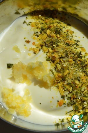 Сметану смешать с раздавленным зубчиком чеснока и специями (у меня были специальные для салата), дать заправке настояться 5 минут. Для мужчин, скорее всего, подойдет заправка из домашнего майонеза, чеснока и зелени.