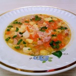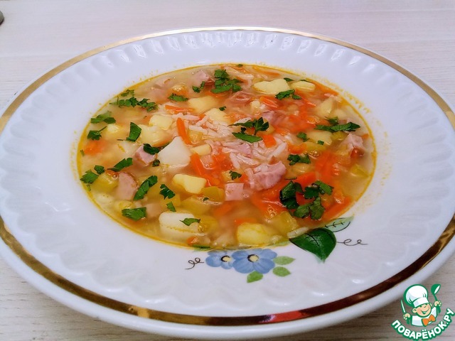 Как картофель будет готов, солим суп по вкусу, добавляем в суп пассеровку, перец, помидоры. Осторожно перемешиваем, чтобы не сломать картофель, даем супу закипеть. Выключить огонь, настоять суп 10 минут, разлить по тарелкам и посыпать порубленной зеленью.