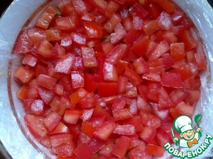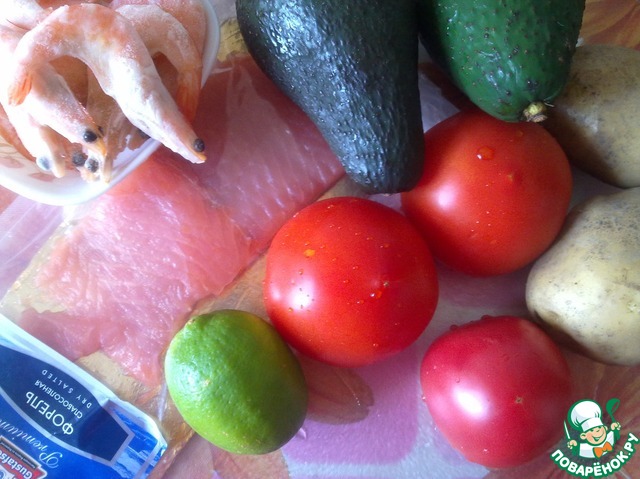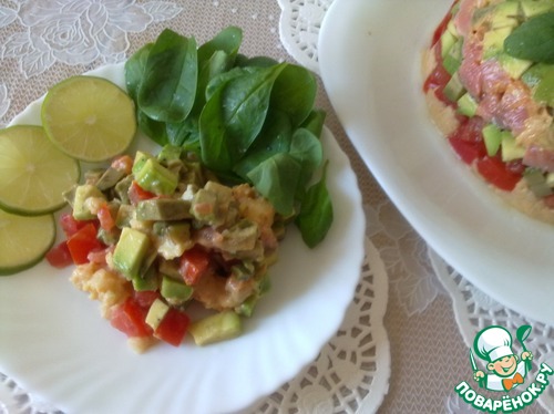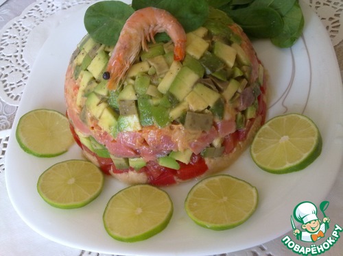 Следующий слой креветки. Затем слой форели. Потом опять авокадо (оставшуюся часть). Затем помидоры.