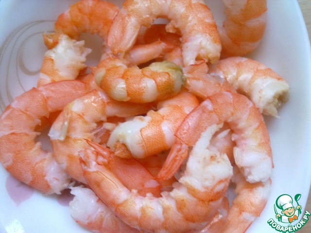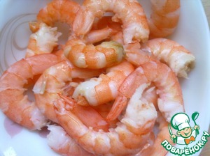 Креветки отварить, очистить, порезать, добавив нарезанный укроп и заправить половиной соуса. Мелко нарезать форель.