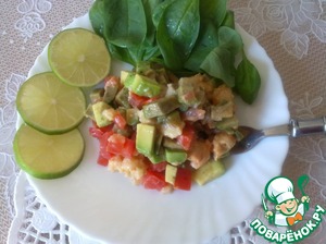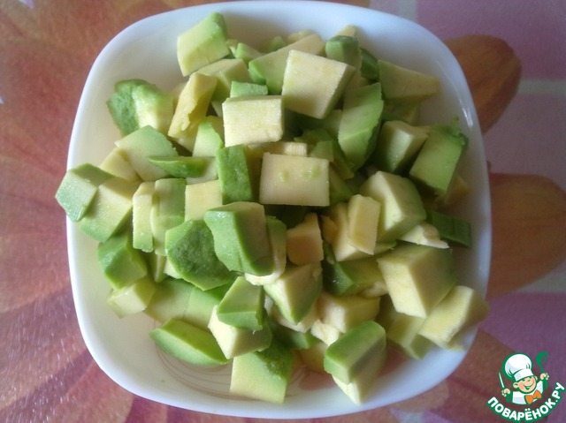 Авокадо разрезать, удалить косточку и очистить. Порезать кубиками, заправить соком лайма, посолить, поперчить по вкусу.