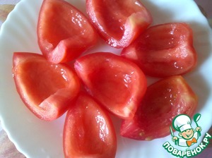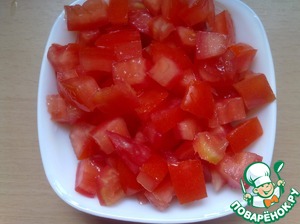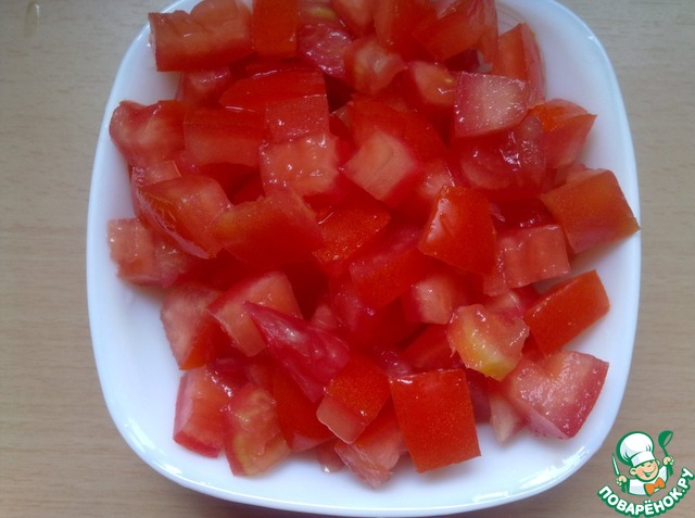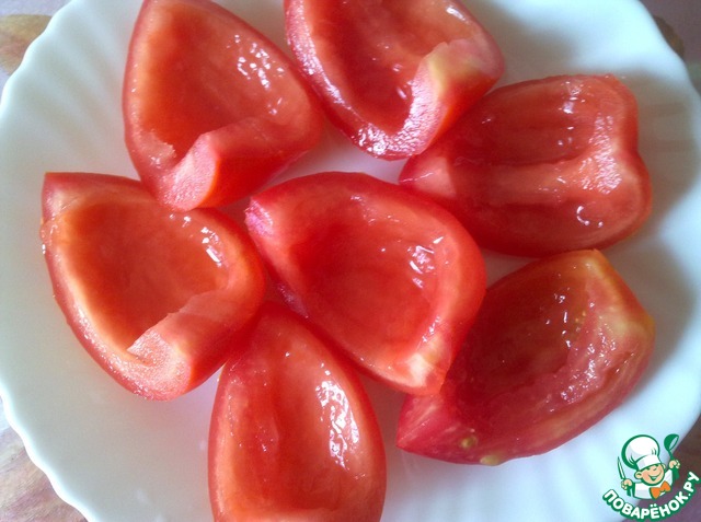 Отварить картофель. Готовый картофель размять вилкой, заправить оставшимся соусом, посолить по вкусу и тщательно перемешать. Из помидор удалить сердцевину с семечками.