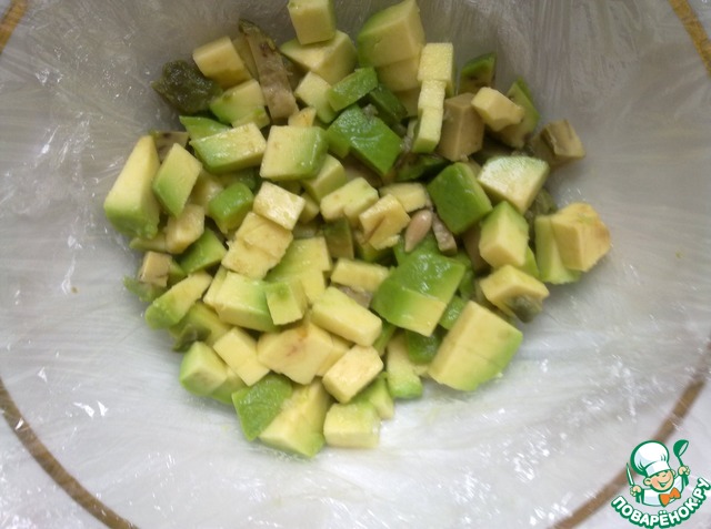Когда все ингредиенты будут готовы, можно собирать салат. Для этого форму для салата выложить пищевой плёнкой. На нижний слой уложить половину нарезанного авокадо.