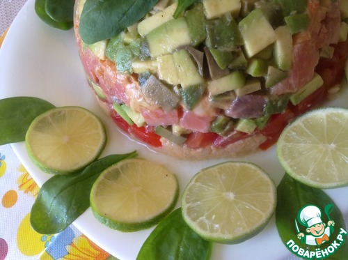 Перед подачей снять верхний слой пищевой плёнки. На форму сверху положить сервировочное блюдо и резким движением перевернуть всю конструкцию салата таким образом, чтобы блюдо оказалось внизу. Осторожно снять форму и убрать пищевую плёнку. украсить салат зеленью, дольками лайма. Угощайтесь!