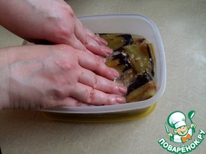Вылейте остатки маринада и масла в контейнер на баклажаны.