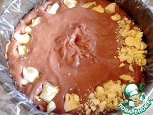 Выкладываем шоколадный крем в форму выстланную пищевой пленкой, по кругу выкладываем часть наломанного безе и сверху опять заливаем остатками шоколадного крема.