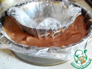 Внутрь шоколадной массы ставим небольшую емкость, обернутую пищевой пленкой и убираем в морозилку для застывания.