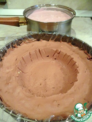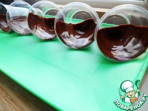 • Внутрь шоколадной массы ставим небольшую емкость, обернутую пищевой пленкой и убираем в морозилку для застывания.
