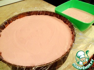 И все сверху заливаем вишневой массой и ставим в морозилку, оставив небольшую часть застывать в отдельной чаше для декора.