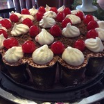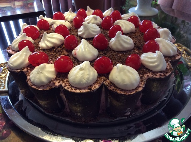 50г шоколада растворить на водяной бане и промазать шоколадом ½ часть пластикового стаканчика, поставить в морозилку. Расстричь стаканчики, вынуть шоколадные полустаканы, прикрепить их к краям готового торта и наполняем их оставшимся вишневым мороженым, сверху украшаем безе, вишнями и шоколадом.