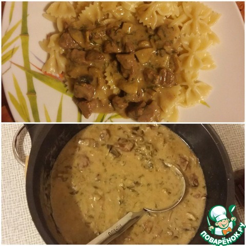 Или... Говядина с грибной подливкой по мотивам бефСтроганова … от Любимой Предупреждаю сразу. В процессе приготовления этого блюда, я выступал в качестве кухонного мальчика. Разделать мясо, нарезать зелень и грибы и всякое-такое прочее…, т. е. исключительно на подсобных работах. А готовила моя любимая супруга. Итак…. Говядина с грибной подливкой по мотивам бефСтроганова … от Любимой.