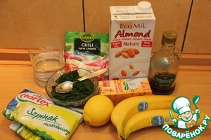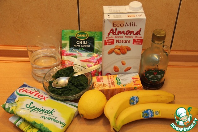 В блендере перемолоть бананы, сироп, шпинат и напиток овсяный (жена любит, а я предпочитаю миндальный).