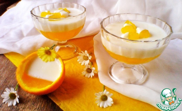 Идея желе в апельсиновых корках не нова, существуем много вариантов. Надеюсь, Вы примете и этот, который я нашла на иностранном кулинарном сайте. Сочетание белого молочного слоя и натурального апельсинового желе нам очень понравилось.