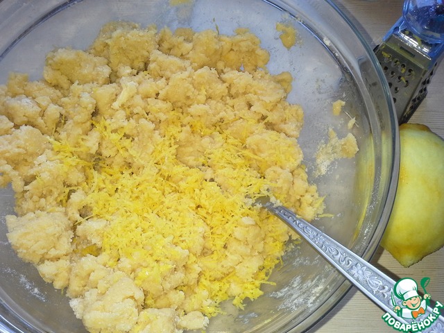 Муку смешиваем с 1 стаканом сахара, солью (1/4ч. л.) и разрыхлителем. Добавляем одно яйцо и размягченное сливочное масло, тщательно разминаем вилкой. Получается рассыпчатая крошка. Натираем цедру лимона, перемешиваем.