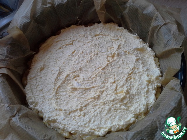 Форму для выпечки выстилаем бумагой для выпечки и выкладываем половину теста, разравниваем ровным слоем. Недавно прочитала у опытного поваренка avani секрет для "мокрых" пирогов и решила испробовать: белок второго яйца выливаем на тесто и катаем, остатки слить. Желток добавляем в творог, солм, перемешиваем. Творожную начинку ровным слоем выкладываем на тесто.