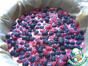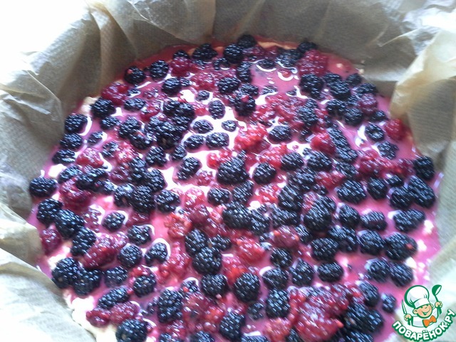 Крахмал смешиваем с лимонным соком и осташимся сахаром и аккуратно перемешивпем с ягодами. Выкладываем ягодную начинку ровным слоем на творожную.